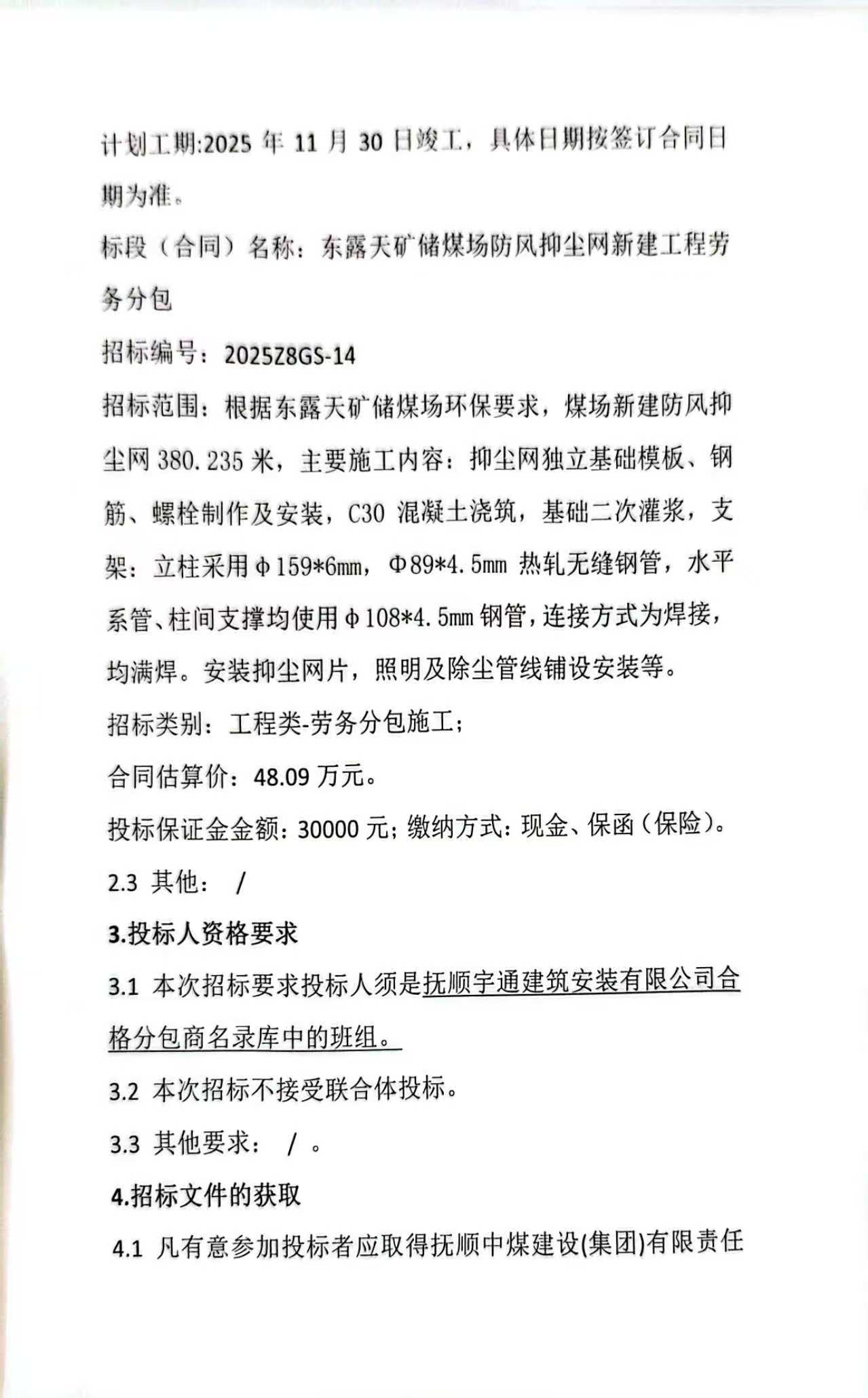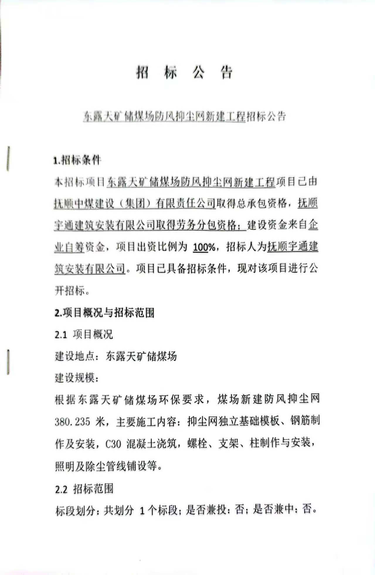 招标公告-东露天矿储煤场防风抑尘网新建工程(10月23日)